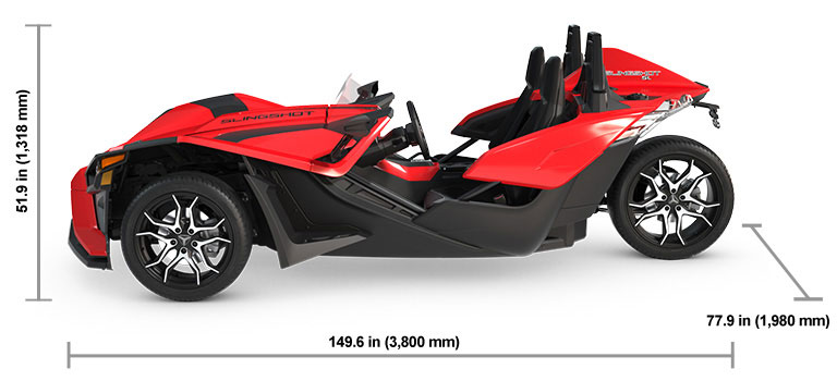 Slingshot® is a three-wheeled motorcycle. It is not an automobile. It does not have airbags and it does not meet automotive safety standards. Three wheel vehicles may handle differently than other vehicles, especially in wet conditions. Always wear a DOT-approved full-face helmet and fasten seatbelts. The Driver may need a valid motorcycle endorsement. Don't drink and drive.